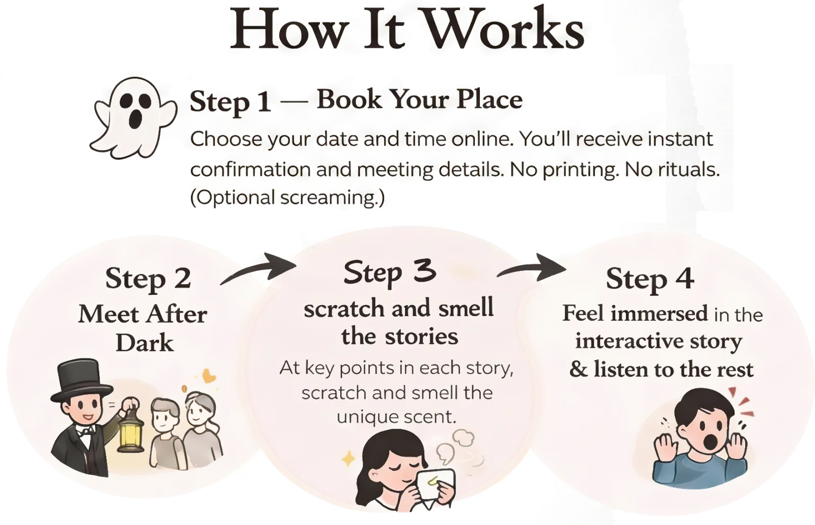 Not at all. Solo guests are surprisingly common — and after about three minutes, everyone is too busy being intrigued, amused, or mildly unsettled to care who arrived with whom. By the end, you won’t feel alone… just pleasantly haunted.